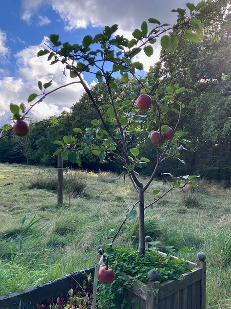 The festival organiser kindly came round and presented me with this most adorable patio apple tree. I had no idea that trees could be portable⦠which has very much suited my lifestyle of recent years. The fruit is remarkably delicious and, at time of writing, she is laden with imminent apples. Because this tree is my height Iāve developed such a sweet relationship with her. I can see her in her entirety and witness the incredible seasonal changes she goes through. Each winter I canāt imagine there can be any life left in the bare bones and each spring she bursts forth with vibrant green buds miraculously.